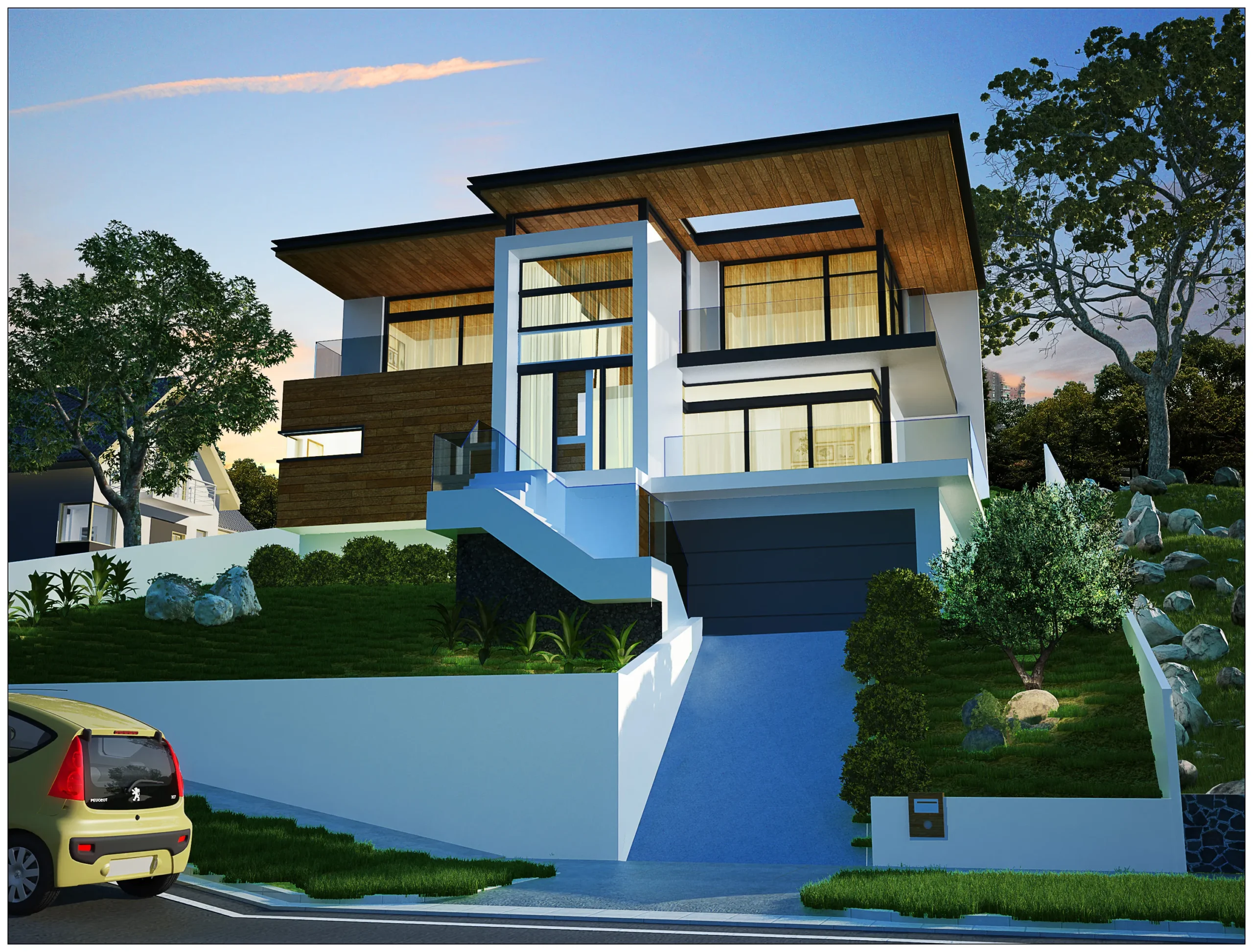 Internally, each level is thoughtfully positioned to follow the natural contours of the land, ensuring a fluid transition between spaces while maximizing light, ventilation, and views. The deep eaves provide shade and protection, reinforcing the home’s energy efficiency and architectural depth.