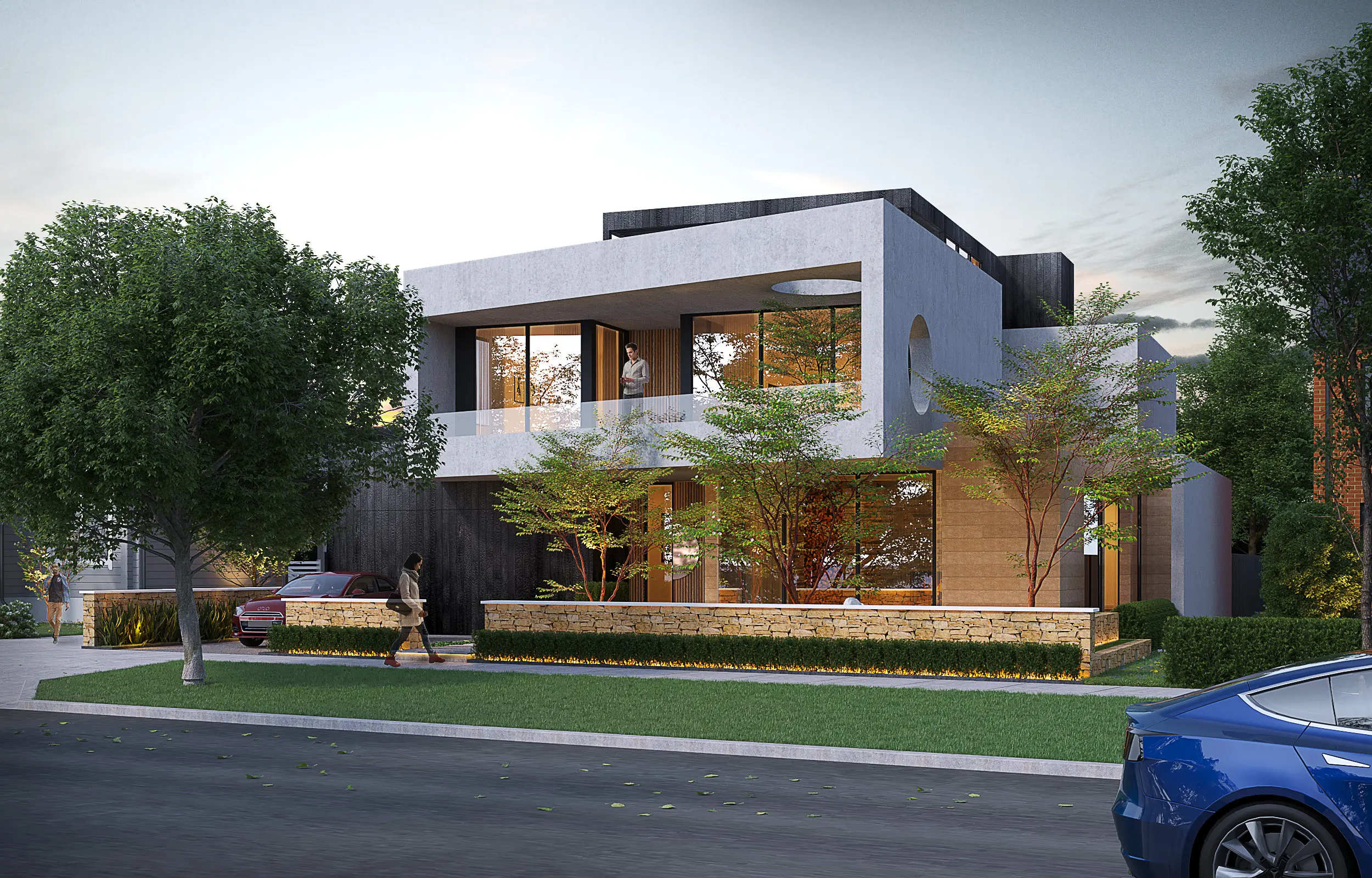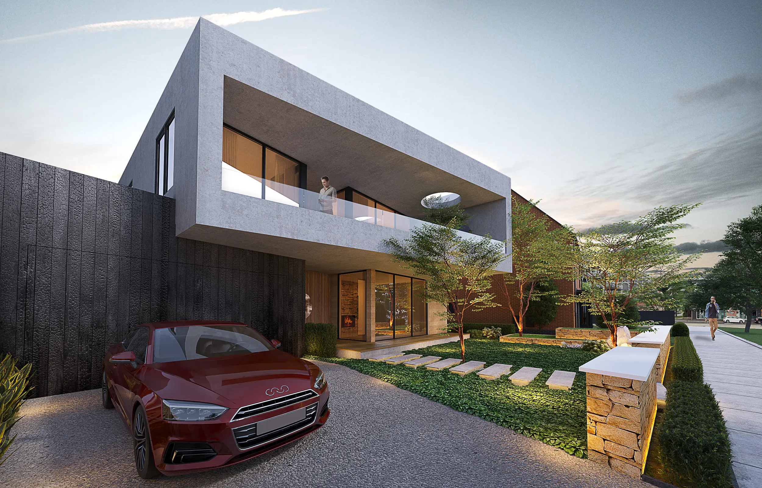 Skyline Edge is a striking contemporary home that masterfully balances raw sophistication with warmth and texture. Designed for those who appreciate cutting-edge architecture, this residence boasts breathtaking views of the urban skyline, seamlessly framed by bold geometric forms and sculptural elements. The exterior is a dramatic composition of exposed concrete, exposed brickwork, and charred timber, creating a refined yet moody aesthetic. Carefully placed circular cutouts in the balcony serve as both functional and artistic design elements, casting ever-changing patterns of light and shadow while offering a unique visual experience. Additional brickwork and natural timber finishes introduce an inviting warmth, grounding the home in tactile beauty. Every element of Skyline Edge is meticulously crafted to celebrate contrast: raw and refined, solid and open, dramatic yet intimate. This is not just a home—it’s a sculptural retreat that redefines contemporary urban living.