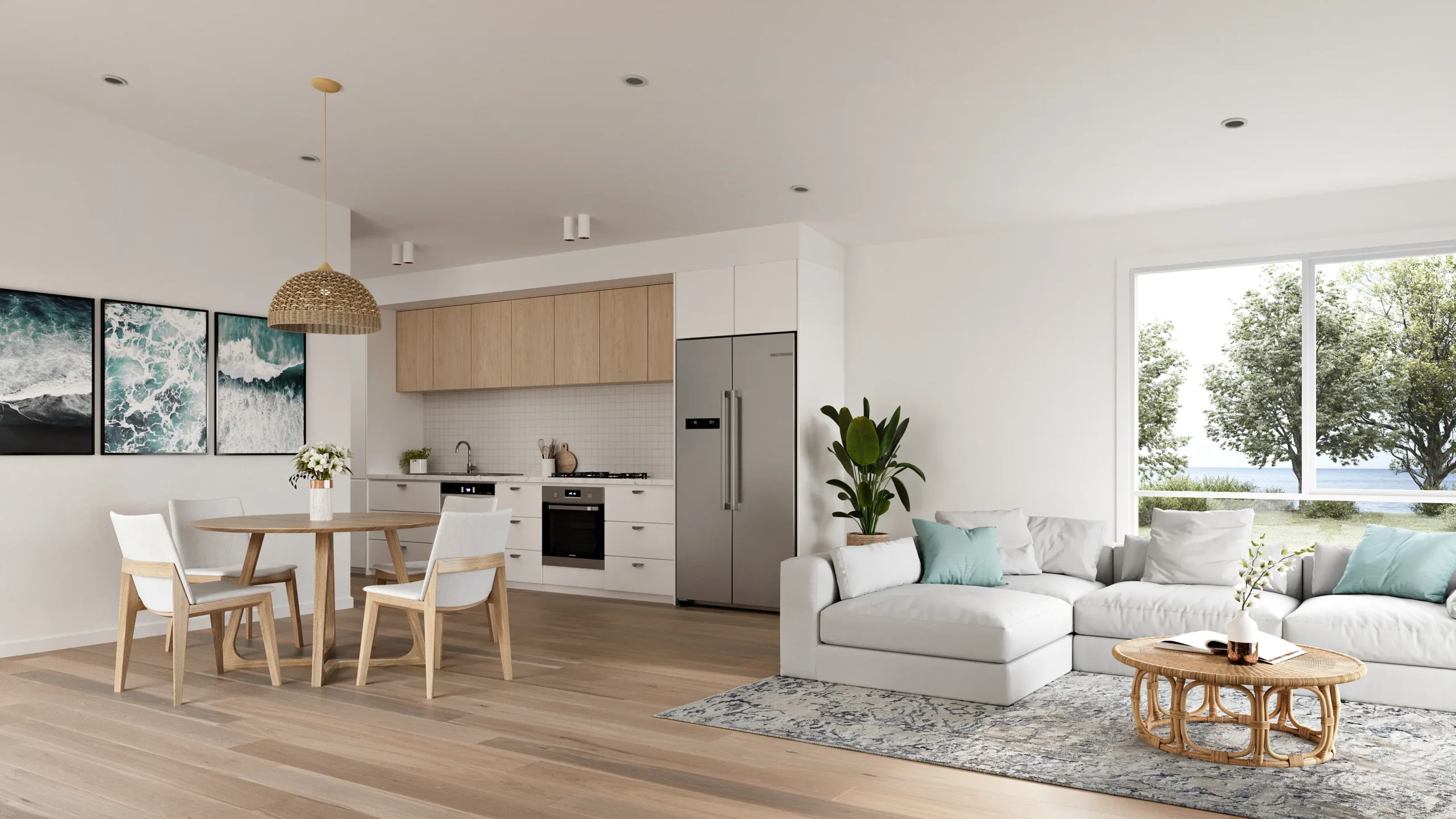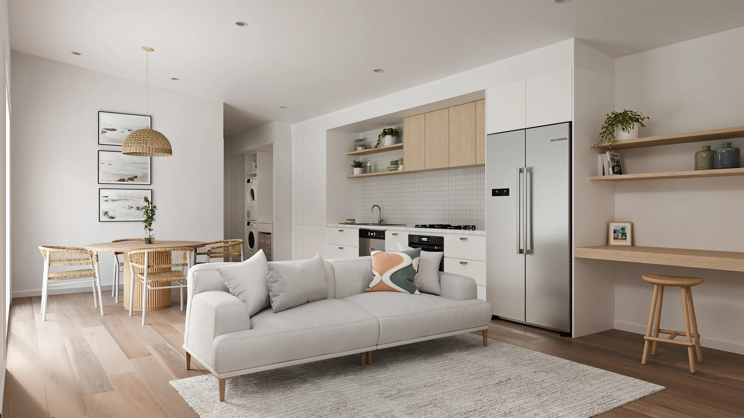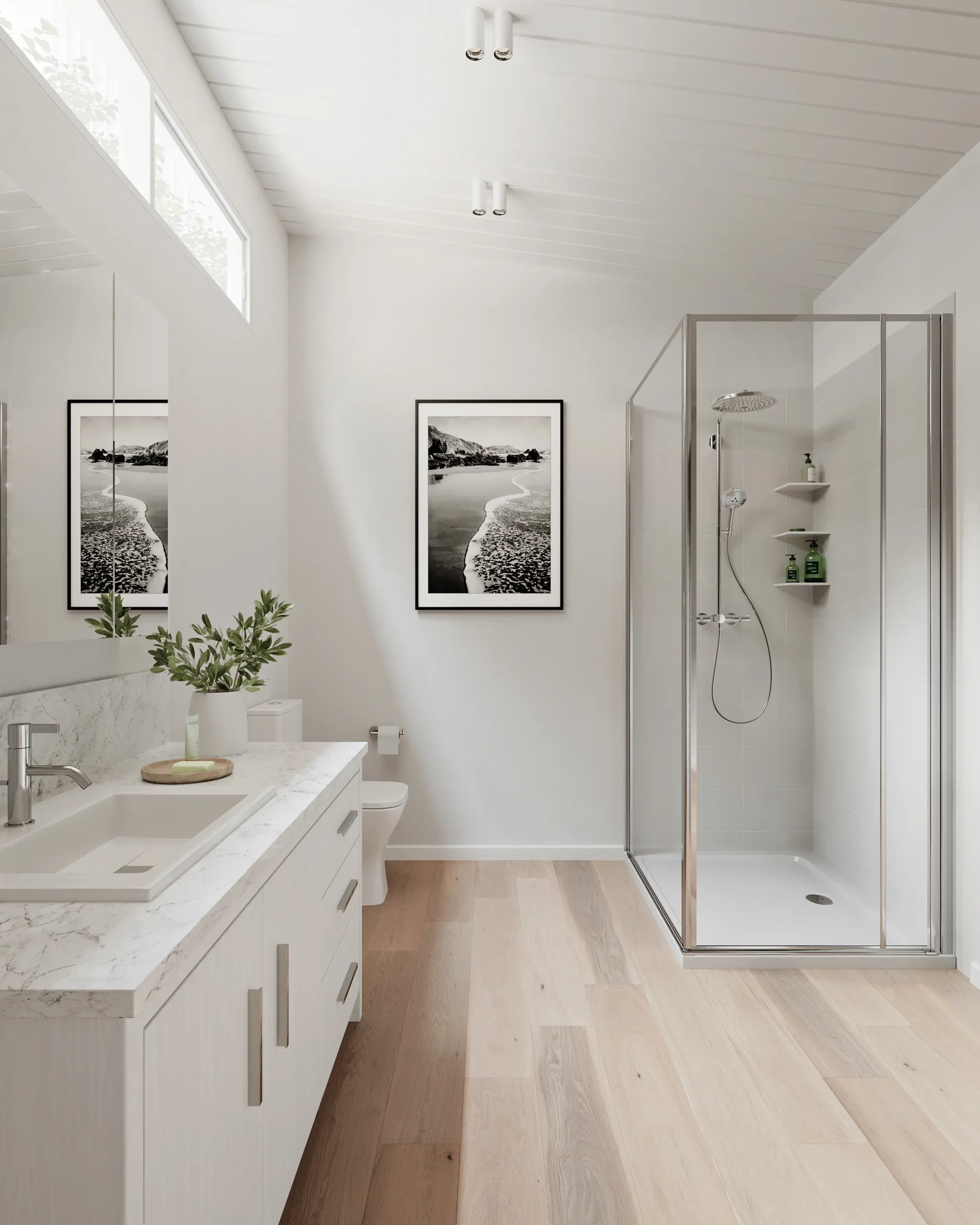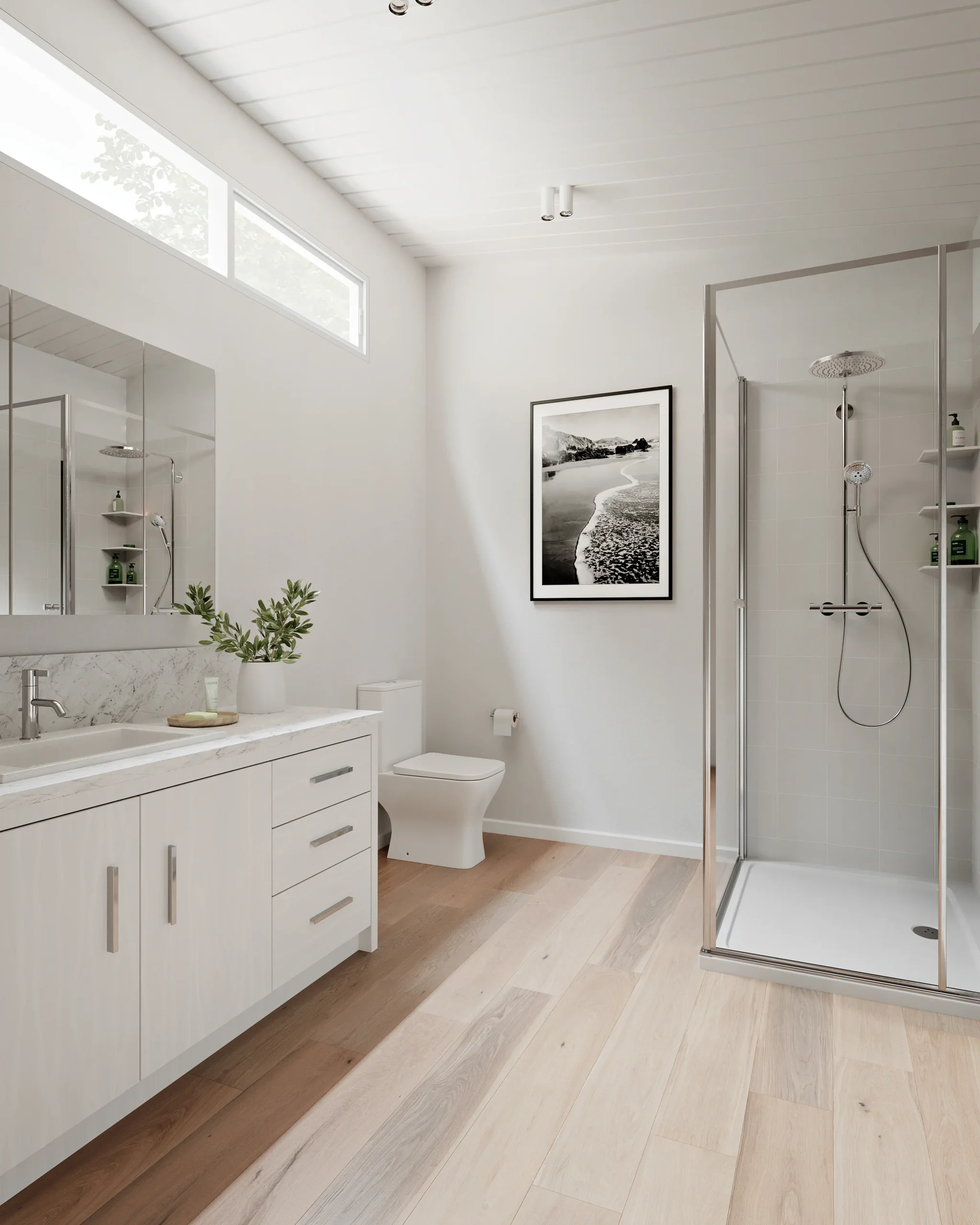 Step into Timeless Elegance, a home interior that embodies sophistication through a refined palette of light tones and natural textures. Designed to exude openness and tranquility, this space is defined by crisp white walls, sleek white cabinetry, and warm timber finishes, creating a harmonious balance between brightness and warmth. The living area is a vision of understated luxury, where natural light enhances the airy ambiance. Wide timber flooring stretches across the space, adding depth and inviting warmth, while carefully crafted timber cabinetry introduces an organic touch, seamlessly integrating storage with style. Minimalist detailing and subtle textures ensure the interior feels both modern and inviting. In the bathroom, a sense of spaciousness is amplified by clerestory windows, which flood the room with natural light while maintaining privacy. The interplay of white surfaces and timber cabinetry creates a spa-like atmosphere, where simplicity and elegance meet. Every element has been thoughtfully designed to enhance the feeling of serenity, making the space feel even larger than it is. With a seamless blend of light, space, and natural textures, Timeless Elegance offers a contemporary yet inviting retreat—where every detail is crafted for comfort, beauty, and a sense of effortless sophistication.