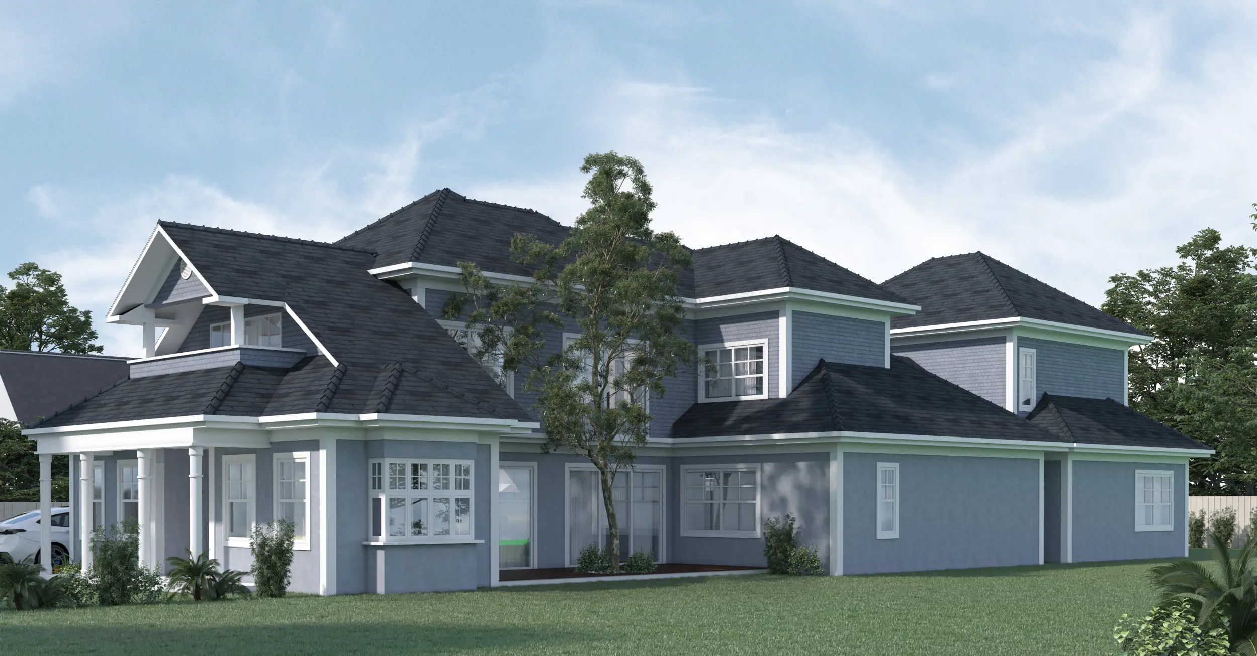 This house exhibits a refined blend of traditional and contemporary architectural elements, characterized by its expansive, multi-tiered hip and gable roof structure covered in dark shingles, offering both visual depth and practical weather resistance. The exterior features a soft grey color scheme complemented by white trim accents, enhancing its timeless elegance. Large, symmetrically placed windows allow for ample natural light, while a combination of horizontal siding and shingle cladding adds textural contrast. A covered porch supported by classical columns provides a welcoming entrance, leading to a spacious and well-landscaped yard. The upper-level balcony, integrated seamlessly within the gable roof, adds charm and functionality, creating a connection between indoor and outdoor spaces. The house’s sprawling layout suggests a focus on comfort and luxury, with multiple access points and well-defined living areas. Overall, this design achieves a balance between grandeur and modern livability.